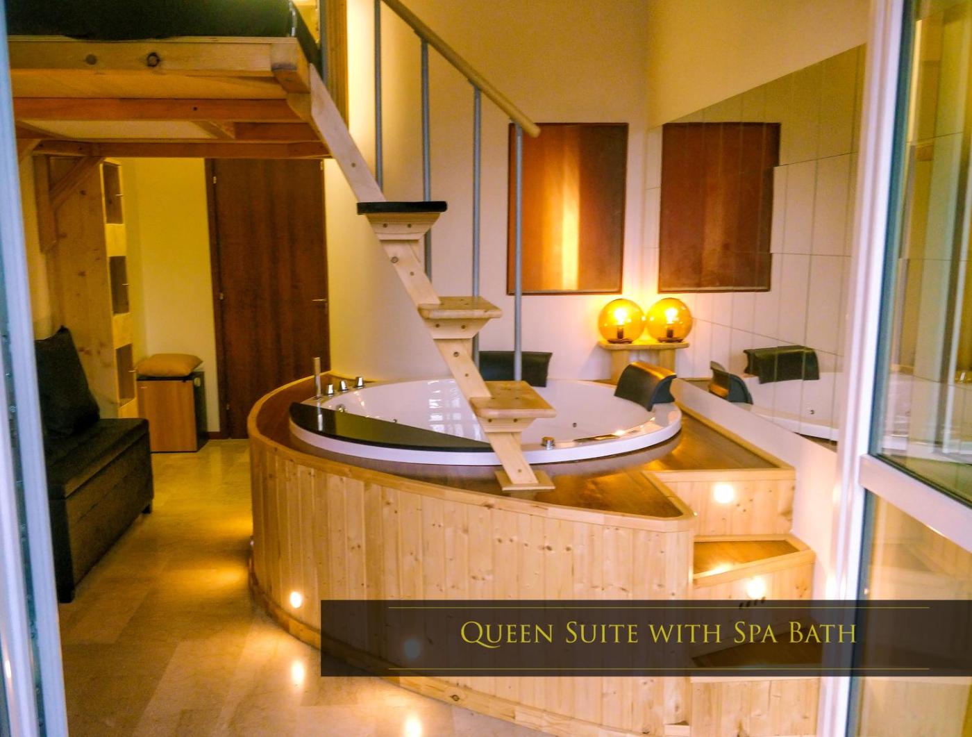 Queen Suite with Spa Bath. This suites standout feature is the hot tub. This suite includes 1 living room, 1 separate bedroom and 1 bathroom with a bath and free toiletries. The air-conditioned suite offers a flat-screen TV with streaming services, soundproof walls, a coffee machine, a seating area as well as city views. The unit has 1 bed.