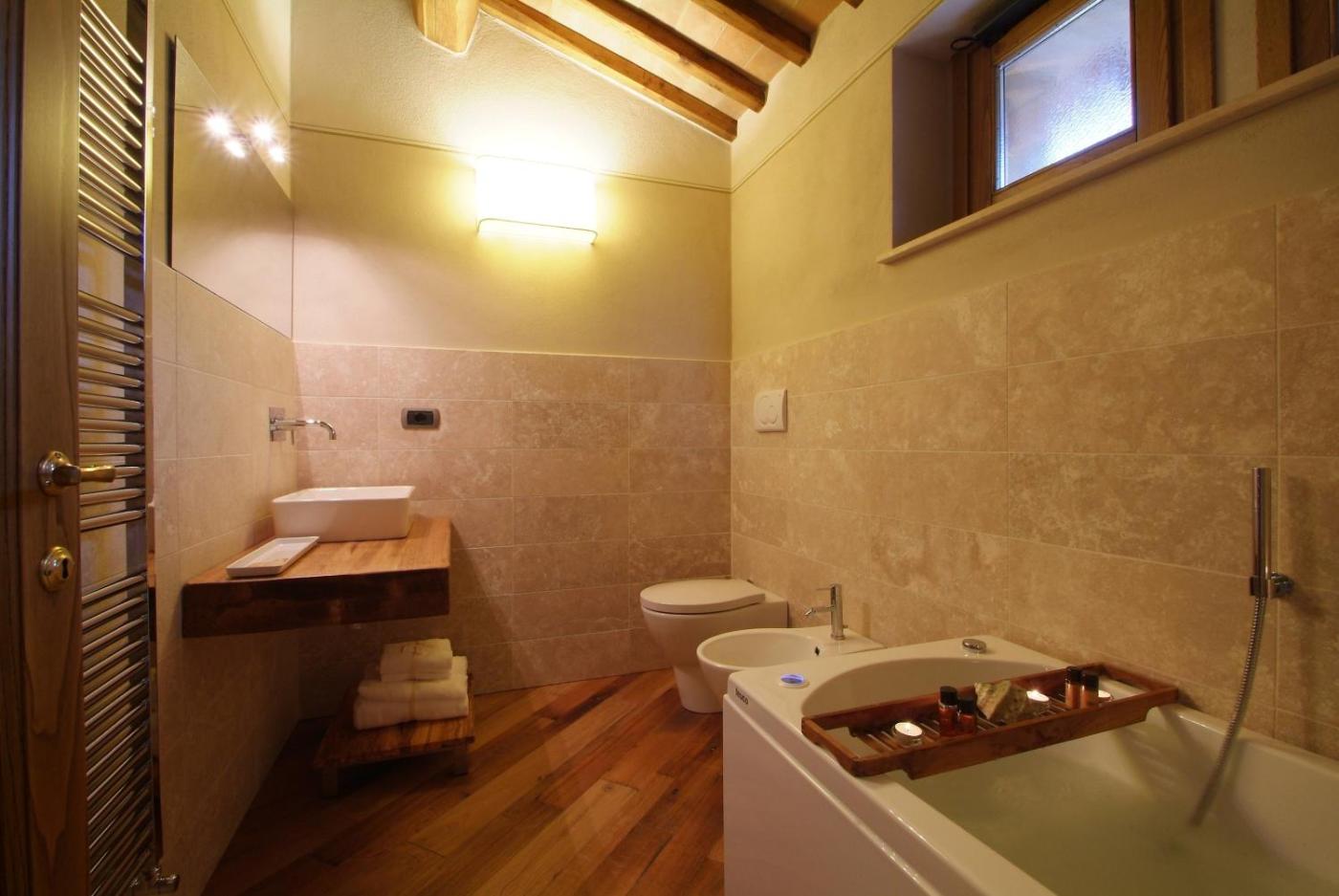 Two-Bedroom Apartment - Split Level. This elegant apartment has traditional Tuscan furnishings and wood-beamed ceilings. It is composed of 2 bedrooms with 2 bathrooms, and a double bed in the raised sleeping area. It also comes with a fully equipped kitchenette. Wi-Fi is free. The rate for 2 people includes the linen and towel kit. If you need separate rooms, you will need to pay extra for sheets. In this case please inform the property in advance. You can use the Special Requests box when booking or contact the property directly using the contact details provided in your confirmation. ;