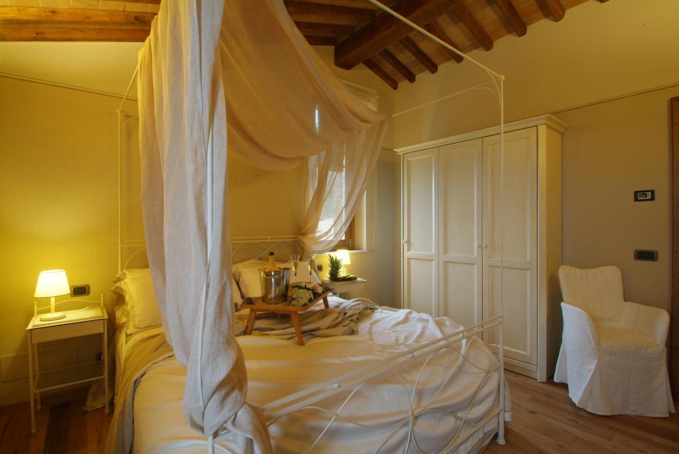 Wrought-iron beds and wood-beamed ceilings characterise apartments at Borgo Canalicchio Di Sopra Relais. Each has a fully equipped kitchen and comfortable lounge area.