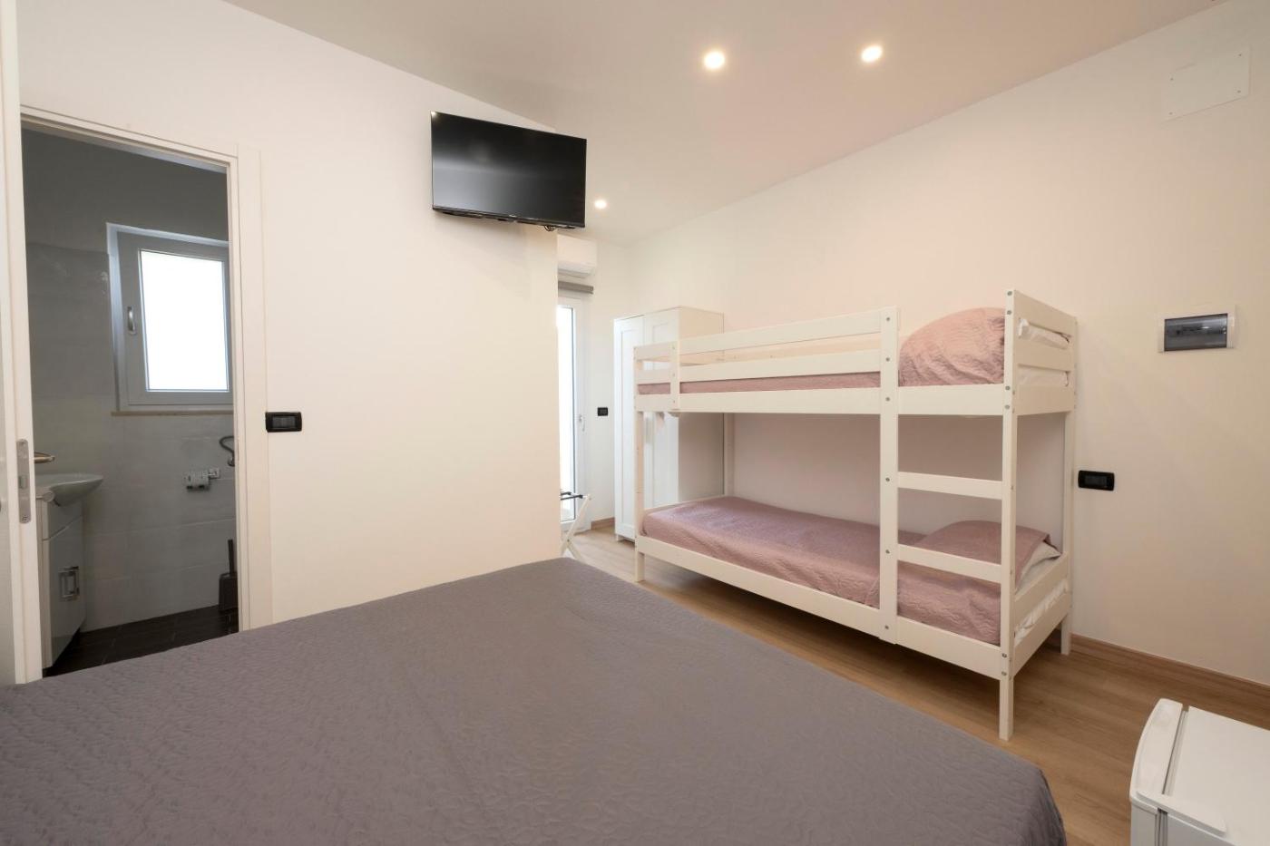 Quadruple Room. The quadruple room has a private bathroom, air conditioning, a tea and coffee maker, as well as a seating area with a flat-screen TV. This quadruple room features a dining area, a wardrobe, TV, as well as chocolate for guests. The unit has 3 beds.